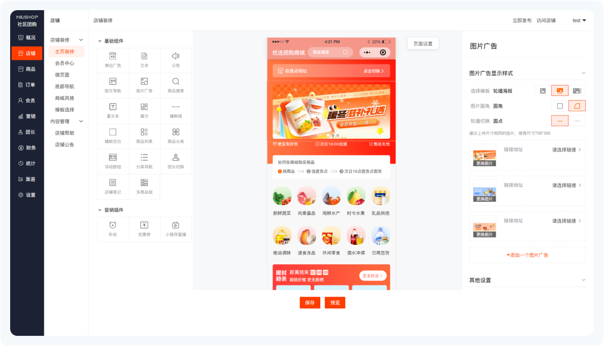 丰富营销活动,秒杀、团购、限时抢购,天天都有新玩;提高产品的曝光度和销量,特价促销拉动店铺人气吸引新粉丝激活老用户,有效提升用户购买转化。